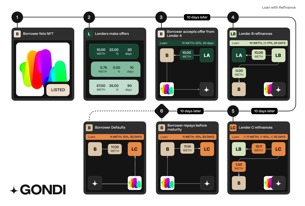 In case the loan is not repaid before maturity, the lender can claim the escrowed NFT and transfer it to its wallet.