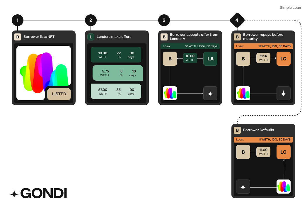 <figure><img src="https://content.gitbook.com/content/W2WSJrV6PSLWo4p8vIGq/blobs/cfJfaceVtJPyv6iJoafP/Simple%20Loan.png" alt=""><figcaption><p>Gondi Loan without refinancing</p></figcaption></figure>